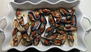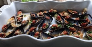 | Mix of cheese panko and fresh herbs, tomato sauce, cooked mussels in half shell, warm crusty bread to tear and share, final bites of Mussels au gratin to enjoy! |