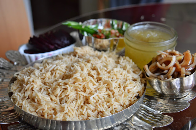 The kheema no palau prepared by some Parsi families inspired this recipe. Some served palau with khichri, while others served it plain. It was served with yoghurt raita or kudhee. A radish and carrot salad is served alongside poppodums and a doryu onion salad (finely sliced onions dipped in tamarind-jaggery chutney).